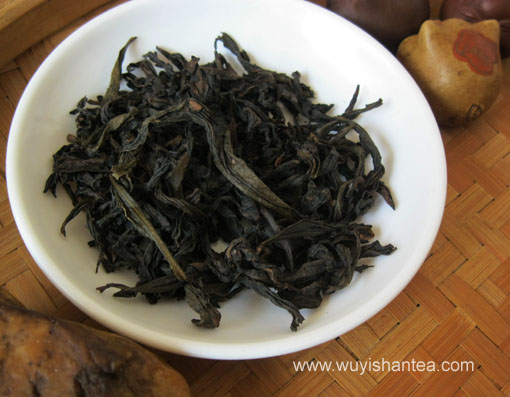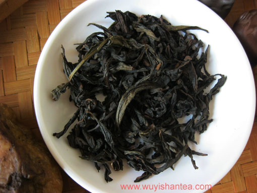 | 【外形】条索较粗壮、壮结,均匀度不好,大小不十分一致,色泽乌黑偏砂绿,干香似有枞味。 |