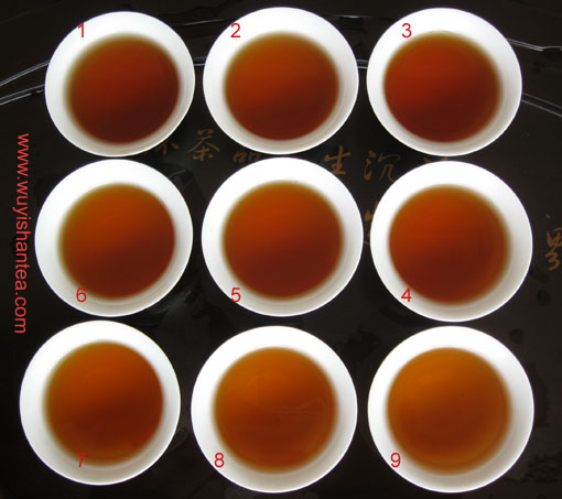 | 4 | ![]() | 【审评】第一泡时长15秒,第二泡时长25秒,第三泡时长40秒,第四泡时长1分钟,第五泡时长1分钟15秒,第六泡时长1分钟30秒,第七泡时长1分钟45秒,第八泡时长2分钟,第九泡时长2分钟30秒。(每次水温都保持100℃) 【内质】香气中带着木屑老枞味,香气及茶汤中可闻到“树林”及“树龄”的味道;回甘不错,令人喉底生津,微凉,挂喉感好,到后几泡有幽香飘出展,这是岩韵强的缘故。此款茶特色:1、木屑老枞味 2、岩韵强。汤色深橙黄色。 |